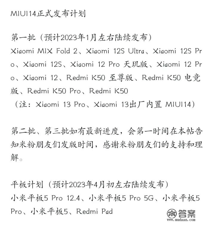 小米机型:小米13、小米13 Pro、小米12S、小米12S Pro、小米12S Ultra、小米12、小米12 Pro、小米12 Pro 天玑版、小米 11 青春版、小米MIX Fold2;红米机型:红米K60、红米K60 Pro、红米K50、红米K50 Pro、红米K50 至尊版、红米K50 电竞版、红米Note 11 Pro、红米Note 11 Pro+;根据此前小米公布的 MIUI 14 发版方案,MIUI 14 首批不变版(正式版)估计在 1 月摆布陆续发布,撑持机型与上述名单根本重合。而平板电脑的 MIUI 14 不变版(正式版)则需要比及 4 月份。