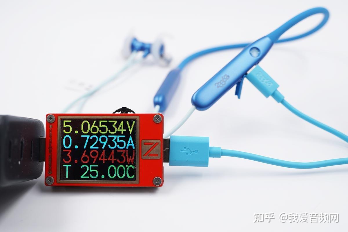 我爱音频网接纳ChargerLAB POWER-Z KT002便携式电源测试仪对233621 Sense颈挂式体温心率监测蓝牙耳机停止有线充电测试,输入功率约为3.69W。