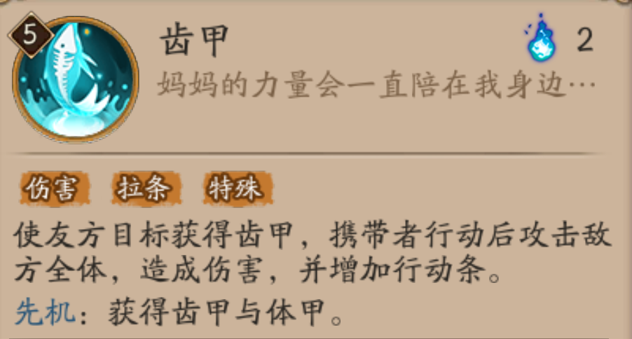 守备姿势时大招:拉条附加抵御防御,切换到进攻姿势;守备时,队友高概率得到骨盾抵御暴击危险,本身普攻替代为鲸骨驻为全体套上骨盾,没盾的(包罗被突破的)队友受伤时肯定还击。