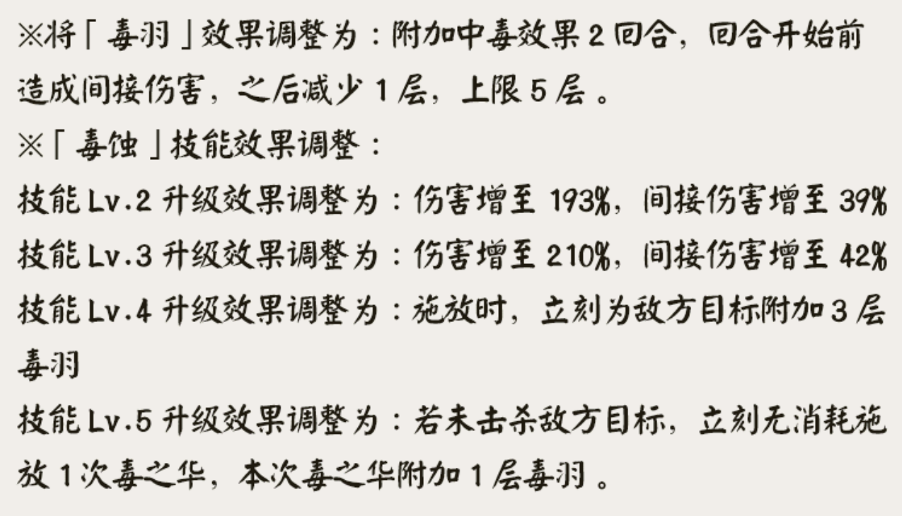 鸩更大的培育难度:满级毒之华11.17 更新中加强了鸩的毒羽和大招,此次加强让毒羽有了更强的减防才能。大招多了附加毒羽才能,固然仍然会施放后清空毒羽,但那对复数出场的鸩没有太大影响,共同蝎女能更好的在击杀大怪时顺带处理小怪。