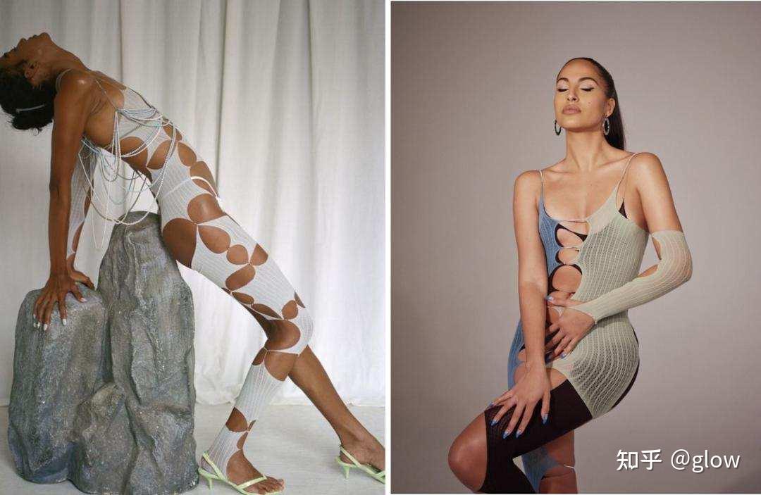那两年大火的独立设想品牌RUI,也是用面料来展现女性的曲线,最重要的是那种露肤度+贴身的针织面料能更大可能的表示出人道感的一面,想来那种贴称身形和皮肤的设想感和20几年前的纪梵希的秋冬科技秀场来用那种科幻面料来展现躯体曲线有着异曲同工之妙。