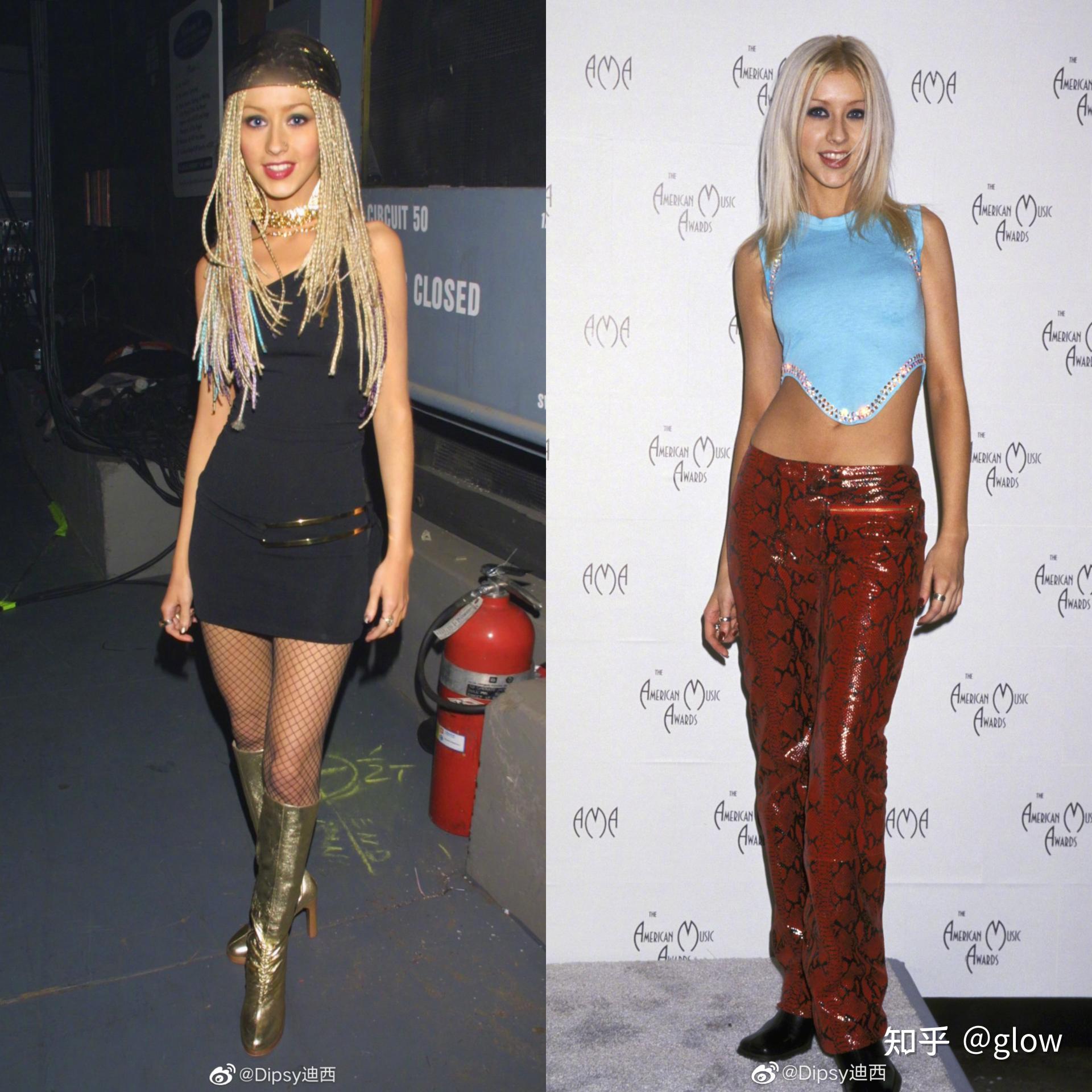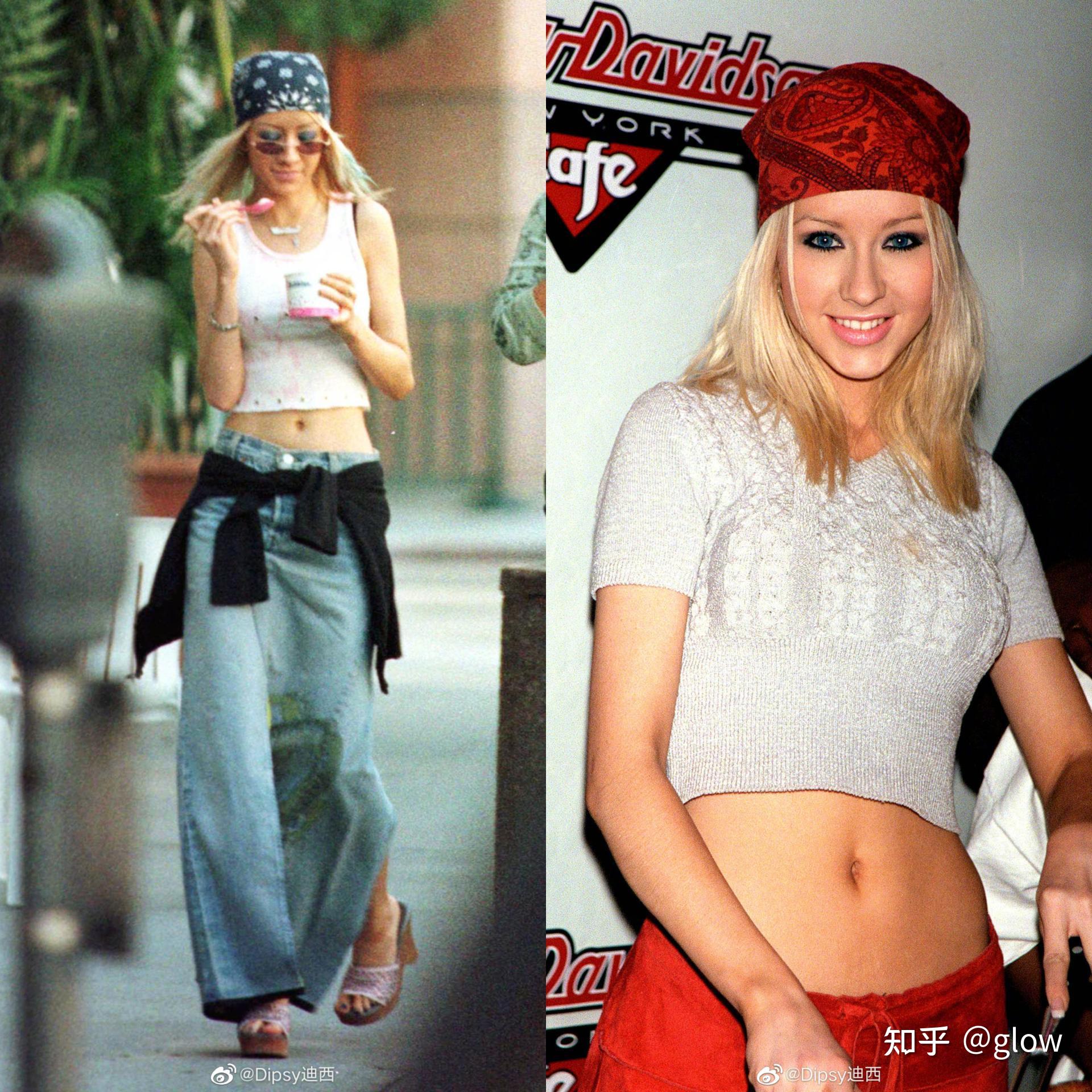 昔时仍是瓶中精灵的擦妈活生生的演绎了什么是千禧辣妹。大面积的露肤度的衣服、牛仔面料、头巾、低腰裤、荧光色、皮革金属材量等等,别的极具色彩张力的妆容和发型也构成了她奇特的千禧辣妹气概。