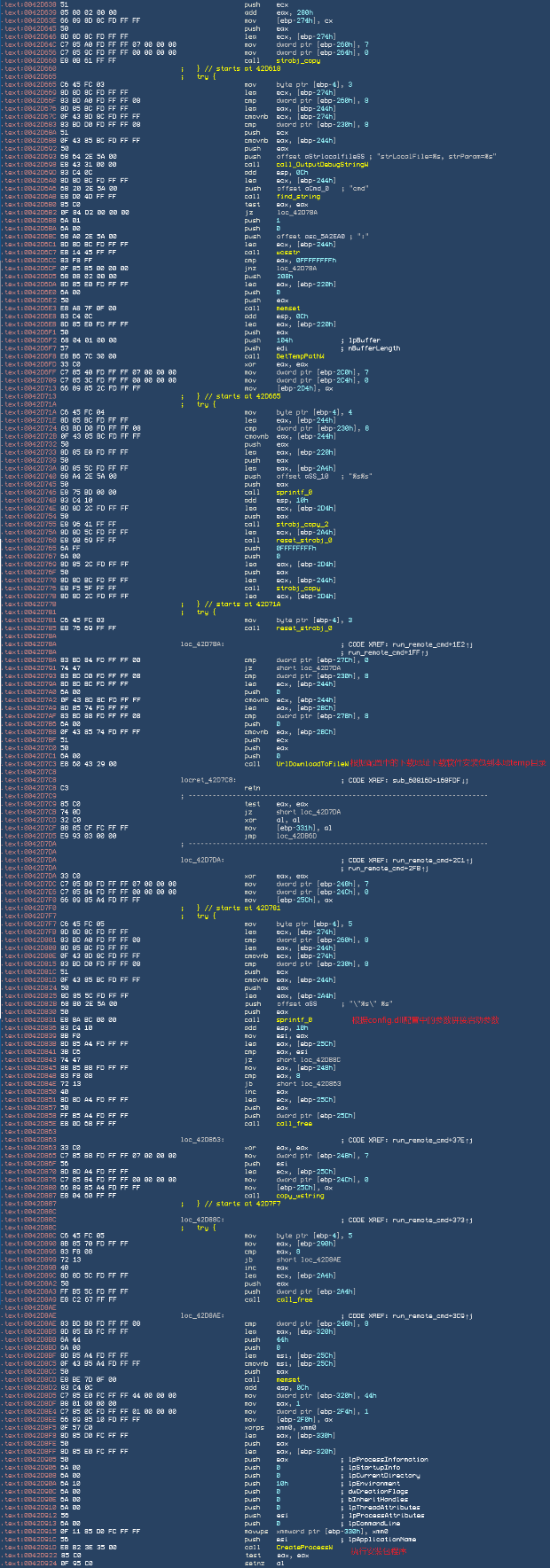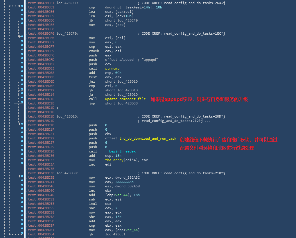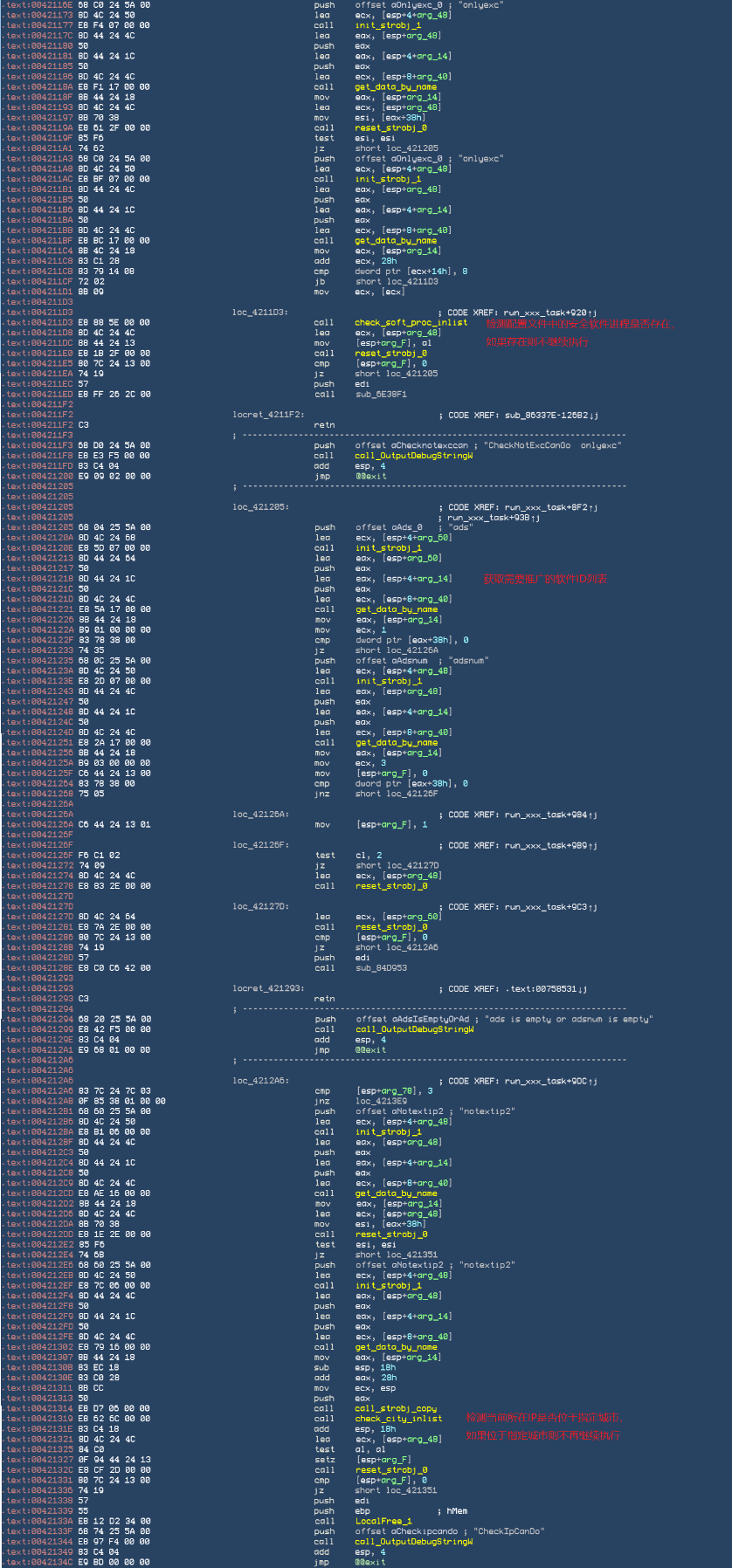 commandtools.exe模块会对设置装备摆设文件中block字段中的所有弹窗和推广模块停止遍历下载施行。每个模块鄙人载之前,能够按照设置装备摆设文件设置一些下载前提,好比检测情况,过滤历程等。下载施行代码,如下图所示: