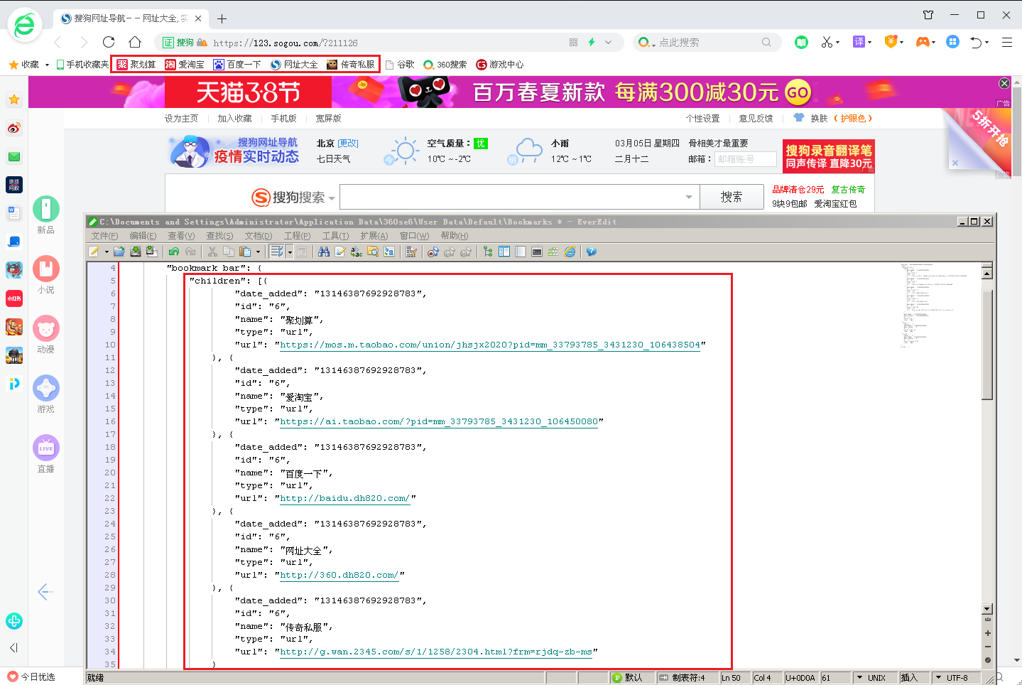 以搜狗阅读器为例,DTPageSet.exe修改阅读器设置装备摆设文件来锁定阅读器主页的相关代码和现象如下图所示: