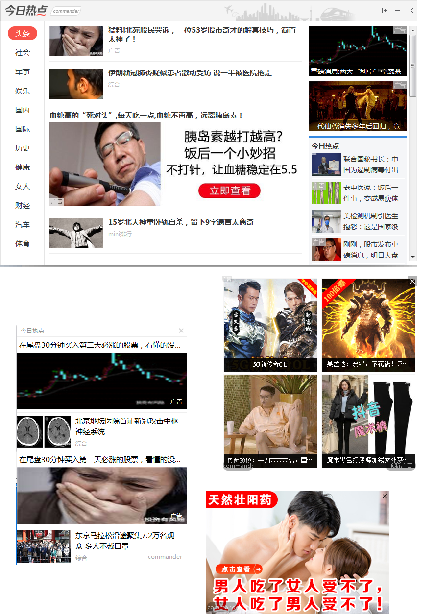 在目前的设置装备摆设中,下发的告白弹窗法式有多个,但只要两种,从办事器下载的途径上看,应该为统一法式的差别版本,不同不大。该告白弹窗模块会频繁弹出,且窗口多样。告白弹窗现象,如下图所示: