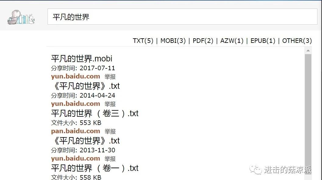 该网站通过百度网盘分享为主,是一个十分小清爽的搜书网站。如检索“普通的世界”后,呈现下面的成果。