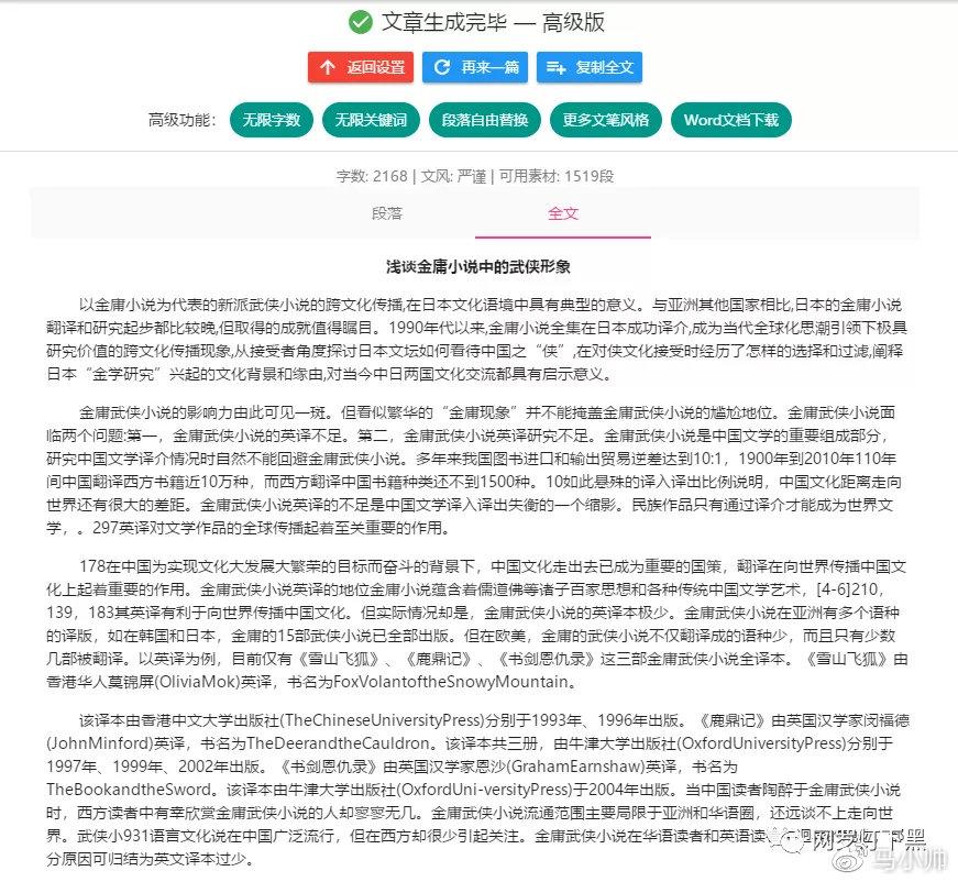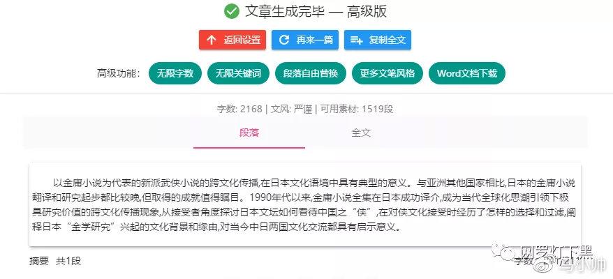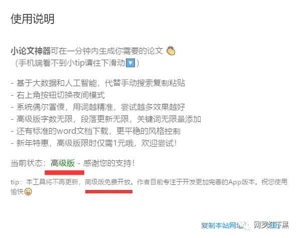 还有一个好动静就是,如今那个小论文神器的高级版已经免费开放了,高级版就是无限字数、无限关键词、段落自在替代、更多文笔气概、Word 文档下载等等。