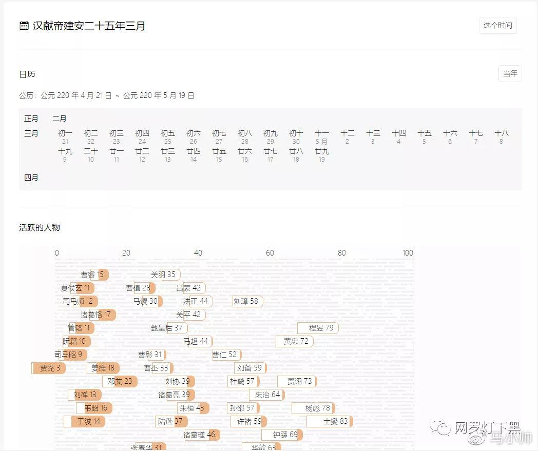 好比说我们看三国故事,对此中次要人物生卒时间可能并非出格领会,尤其是那些汗青人物活泼于什么期间,在那里城S十分曲不雅的展现出来,看到那个你才会发现本来某某两小我的年龄差了那么多。