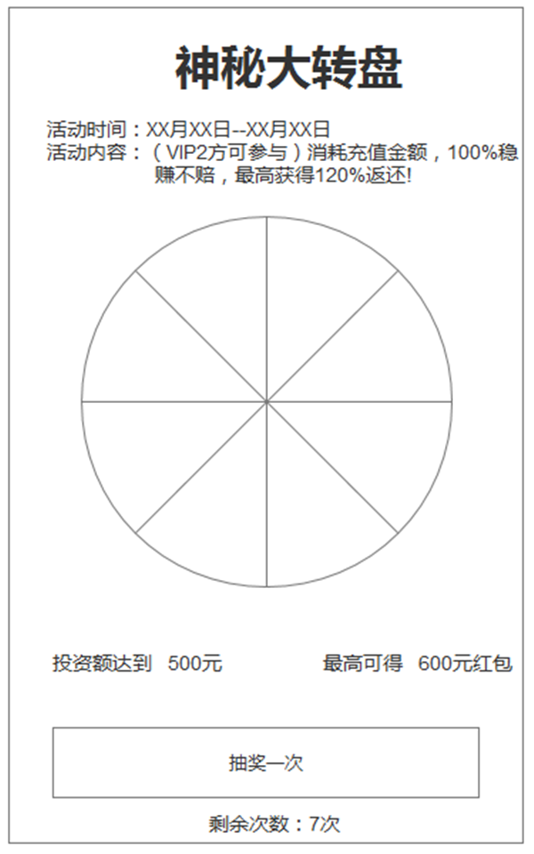 以P2P理财富品设想为例,我们能够设置类似的100%中奖的大转盘活动。起首设想门槛,平台完成100元投资既能够参与此次大转盘初次抽奖,将消耗钻石换成充值金额或者购置投资品总金额,当投资金额3000元能够抽奖一次,获得响应的投资卷或者红包奖励,下次一投资金额到达5000元能够再抽奖一次,转盘上的投资卷或红包额度加大,能够加到很大,用户抽不到罢了,若是希望效果更好能够下方做一个滚动展现区,让少少部门用户能够得到高额投资卷,轮回展现,也能够考虑设想排行榜,后续将会连系游戏中的抽奖和排行榜展开阐述。