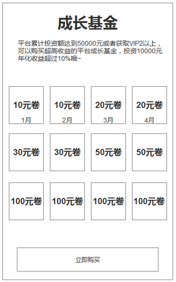 现实产物中那类用户充值后分批返还的例子也很少见,但是参考游戏中的设想,我们能否能够考虑设想那类储蓄返利机造,以P2P平台为例,我们设置用户投资额到达5万时能够购置生长基金,充值10000元,则每月领取必然的投资回报和投资卷,最末将回报控造在年化10%摆布,每月下发的投资卷设置利用倒计时,用户为了不浪费一个投资卷,会持续逃加投资,简单造做模子,抛砖引玉,各人能够在此不竭拓展思虑。