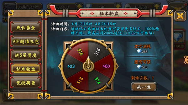 如下图所示,为了刺激玩家完成首充,VIP2才气参与稳赚不赔的大转盘活动,更高能够抽奖7次,第一抽奖前提很容易到达,抽奖成果间接翻倍,即消耗288钻石,获得576钻石,下一次抽奖消耗需要消耗700多钻石,抽取后获得900钻石,消费不竭增加,收益在130-150%之间,刺激玩家持续充值,数值设想合理的情况下,玩家总会觉得间隔下一次消耗很接近,只要再充值50或100元就能够再次抽奖。