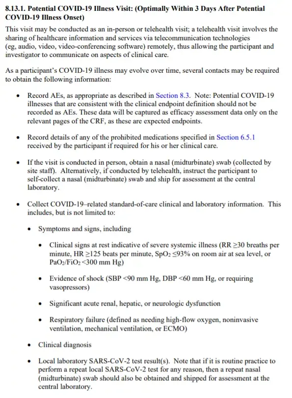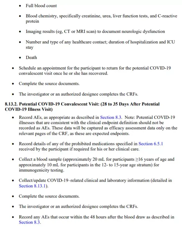 此外,辉瑞在提交的疫苗1,2,3期研究协议(链接:https://media.tghn.org/medialibrary/2020/11/C4591001_Clinical_Protocol_Nov2020_Pfizer_BioNTech.pdf)中详细申明了潜在COVID-19的监测和处置办法,此中包罗了尝试室的新冠病毒检测,CT等影像学检测和血液检测等一些列详细的检测办法。因而,笔者有很大掌握认为“were not PCR-confirmed”是指PCR检测阴性,不成能是没做PCR。