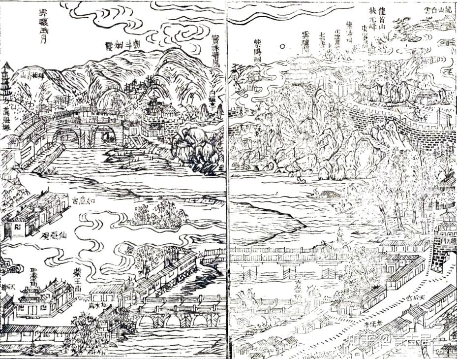 唐世涵版十胜:元岑拱辰,龙巘珠悬,复阁云骧,丽谯虹缀,环雁鸣钟,揖龙正笏,西倚听松,东翘舒啸,乌石干霄,白沤映碧。