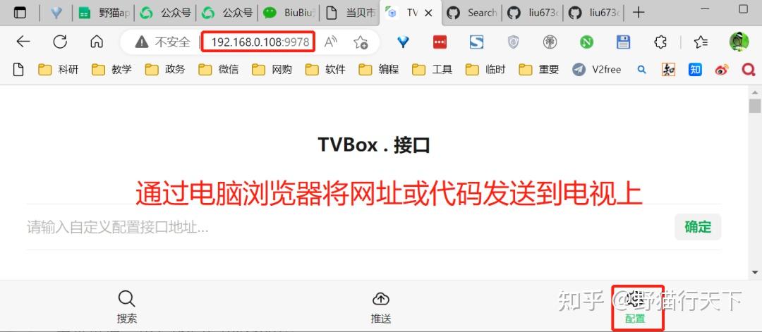 设置装备摆设地址时,能够手动输入网址,如许很费时间;也能够按照屏幕提醒,利用软件自带的长途推送功用(与前文当贝S场的一样),用电脑阅读器翻开指定网址(好比192.168.0.108:9978),然后将列表中任一网址(好比https://raw.liucn.cc/box/m.json)间接发送到电视上。