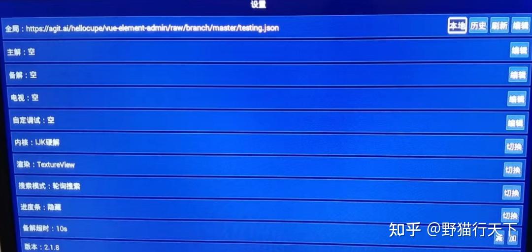 BiuBiu新版被做者改名为了“调试助手”,它的用法跟TVBox大同小异,也是先安拆,然后修改全局接口的网址(即设置装备摆设地址,好比https://agit.ai/hellocupe/vue-element-admin/raw/branch/master/testing.json),如下图所示。