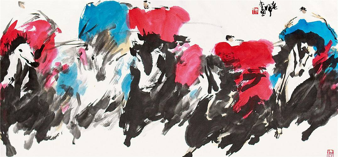 老甲的画简洁、朴厚、奔放,是一种黄钟大吕的艺术。老甲先生的画里除了力和势之外,还有一种气,便是豪壮之气和灵动之气。