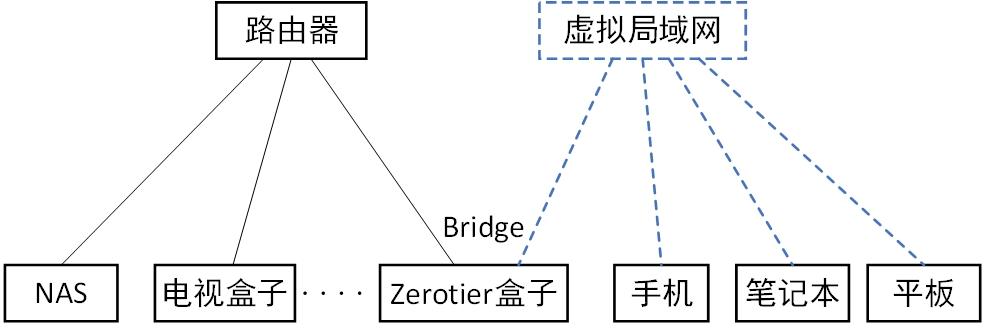 盒子已经设置装备摆设好了Zerotier并参加了我的虚拟收集,接在路由器下面一个lan口,只要那个盒子连结开机形态且收集一般,就能在外拜候家里的收集,如许的益处还有若是NAS不测关机了,能够用手机连上Zerotier虚拟收集,发送一个收集唤醒(wake on lan)恳求给NAS就能够长途开机了,完美!给想揣摩的童鞋送上一张原理图吧: