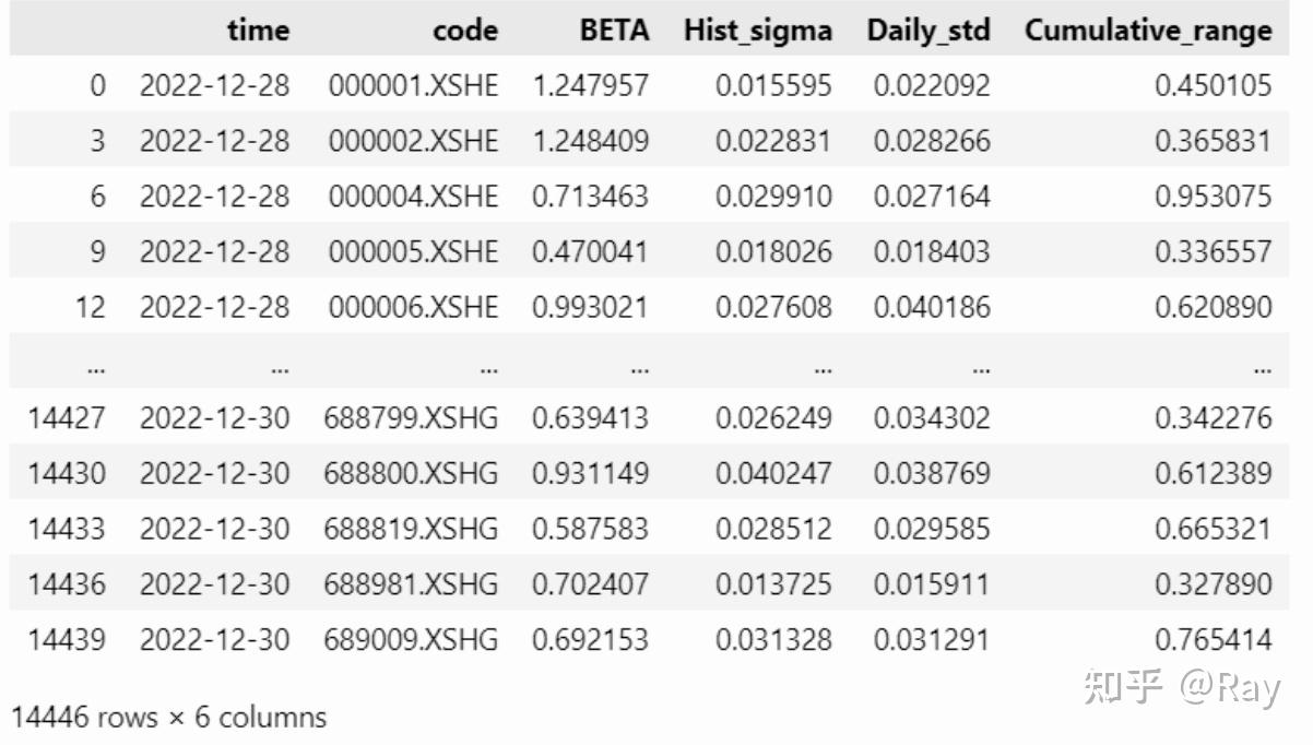 close = pd.pivot_table(price, values=close, index=time, columns=code).fillna(method=ffill, limit=10) pre_close = pd.pivot_table(price, values=pre_close, index=time, columns=code).fillna(method=ffill, limit=10) idx = close.index CMRA = {} for i in track(range(len(close)-window+1), description=正在计算CMRA...): close_ = close.iloc[i:i+window, :] pre_close_ = pre_close.iloc[i, :] pre_close_.name = pre_close_.name - pd.Timedelta(days=1) close_ = close_.append(pre_close_).sort_index().iloc[list(range(0, 253, 21)), :] r_tau = close_.pct_change().dropna(how=all) Z_T = np.log(r_tau+1).cumsum(axis=0) CMRA[idx[i+window-1]] = Z_T.max(axis=0) - Z_T.min(axis=0) CMRA = pd.DataFrame(CMRA).T CMRA.index.name = time CMRA = pd.melt(CMRA.reset_index(), id_vars=time, value_name=Cumulative_range).dropna() factor = factor.merge(CMRA) 3.2.5.代码整合 from rich.progress import track from IPython.display import clear_output def cal_Volatility(codes=None, start_date=None, end_date=None, count=250, window=252, half_life=63): if codes is None: codes = all-stock s, end_date = __start_end_date__(start_date=start_date, end_date=end_date, count=count) start_date, _ = __start_end_date__(start_date=None, end_date=s, count=window) price = get_price(codes=codes, start_date=start_date, end_date=end_date, count=count, fields=[pre_close, close]) hs300 = get_price(codes=[000300.XSHG], start_date=start_date, end_date=end_date, fields=[pre_close, close]) price = pd.concat([price, hs300]).reset_index(drop=True) price[ret] = price[close] / price[pre_close] - 1 ret = pd.pivot_table(price, values=ret, index=time, columns=code) L, Lambda = 0.5**(1/half_life), 0.5**(1/half_life) W = [] for i in range(window): W.append(Lambda) Lambda *= L W = W[::-1] # 计算BETA和Hist_sigma beta, hist_sigma = [], [] for i in track(range(len(ret)-window+1), description=正在计算beta...): tmp = ret.iloc[i:i+window, :].copy() W_full = np.diag(W) Y_full = tmp.dropna(axis=1).drop(columns=000300.XSHG) idx_full, Y_full = Y_full.columns, Y_full.values X_full = np.c_[np.ones((window, 1)), tmp.loc[:, 000300.XSHG].values] beta_full = np.linalg.pinv(X_full.T@W_full@X_full)@X_full.T@W_full@Y_full hist_sigma_full = pd.Series(np.std(Y_full - X_full@beta_full, axis=0), index=idx_full, name=tmp.index[-1]) beta_full = pd.Series(beta_full[1], index=idx_full, name=tmp.index[-1]) beta_lack, hist_sigma_lack = {}, {} for c in set(tmp.columns) - set(idx_full) - set(000300.XSHG): tmp_ = tmp.loc[:, [c, 000300.XSHG]].copy() tmp_.loc[:, W] = W tmp_ = tmp_.dropna() W_lack = np.diag(tmp_[W]) if len(tmp_) < half_life: continue X_lack = np.c_[np.ones(len(tmp_)), tmp_[000300.XSHG].values] Y_lack = tmp_[c].values beta_tmp = np.linalg.pinv(X_lack.T@W_lack@X_lack)@X_lack.T@W_lack@Y_lack hist_sigma_lack[c] = np.std(Y_lack - X_lack@beta_tmp) beta_lack[c] = beta_tmp[1] beta_lack = pd.Series(beta_lack, name=tmp.index[-1]) hist_sigma_lack = pd.Series(hist_sigma_lack, name=tmp.index[-1]) beta.append(pd.concat([beta_full, beta_lack]).sort_index()) hist_sigma.append(pd.concat([hist_sigma_full, hist_sigma_lack]).sort_index()) beta = pd.concat(beta, axis=1).T beta = pd.melt(beta.reset_index(), id_vars=index).dropna() beta.columns = [time, code, BETA] hist_sigma = pd.concat(hist_sigma, axis=1).T hist_sigma = pd.melt(hist_sigma.reset_index(), id_vars=index).dropna() hist_sigma.columns = [time, code, Hist_sigma] factor = pd.merge(beta, hist_sigma) # EWMA计算日尺度差Daily std init_std = ret.std(axis=0) L = 0.5**(1/42) init_var = ret.var(axis=0) tmp = init_var.copy() daily_std = {} for t, k in track(ret.iterrows(), description=正在计算Daily std...): tmp = tmp*L + k**2*(1-L) daily_std[t] = np.sqrt(tmp) tmp = tmp.fillna(init_var) daily_std = pd.DataFrame(daily_std).T daily_std.index.name = time daily_std = daily_std.loc[s:end_date, :] daily_std = pd.melt(daily_std.reset_index(), id_vars=time, value_name=Daily_std).dropna() factor = factor.merge(daily_std) close = pd.pivot_table(price, values=close, index=time, columns=code).fillna(method=ffill, limit=10) pre_close = pd.pivot_table(price, values=pre_close, index=time, columns=code).fillna(method=ffill, limit=10) idx = close.index CMRA = {} for i in track(range(len(close)-window+1), description=正在计算CMRA...): close_ = close.iloc[i:i+window, :] pre_close_ = pre_close.iloc[i, :] pre_close_.name = pre_close_.name - pd.Timedelta(days=1) close_ = close_.append(pre_close_).sort_index().iloc[list(range(0, 253, 21)), :] r_tau = close_.pct_change().dropna(how=all) Z_T = np.log(r_tau+1).cumsum(axis=0) CMRA[idx[i+window-1]] = Z_T.max(axis=0) - Z_T.min(axis=0) CMRA = pd.DataFrame(CMRA).T CMRA.index.name = time CMRA = pd.melt(CMRA.reset_index(), id_vars=time, value_name=Cumulative_range).dropna() factor = factor.merge(CMRA) clear_output() return factor.sort_values(by=[time, code]) f = cal_Volatility(count=3) f