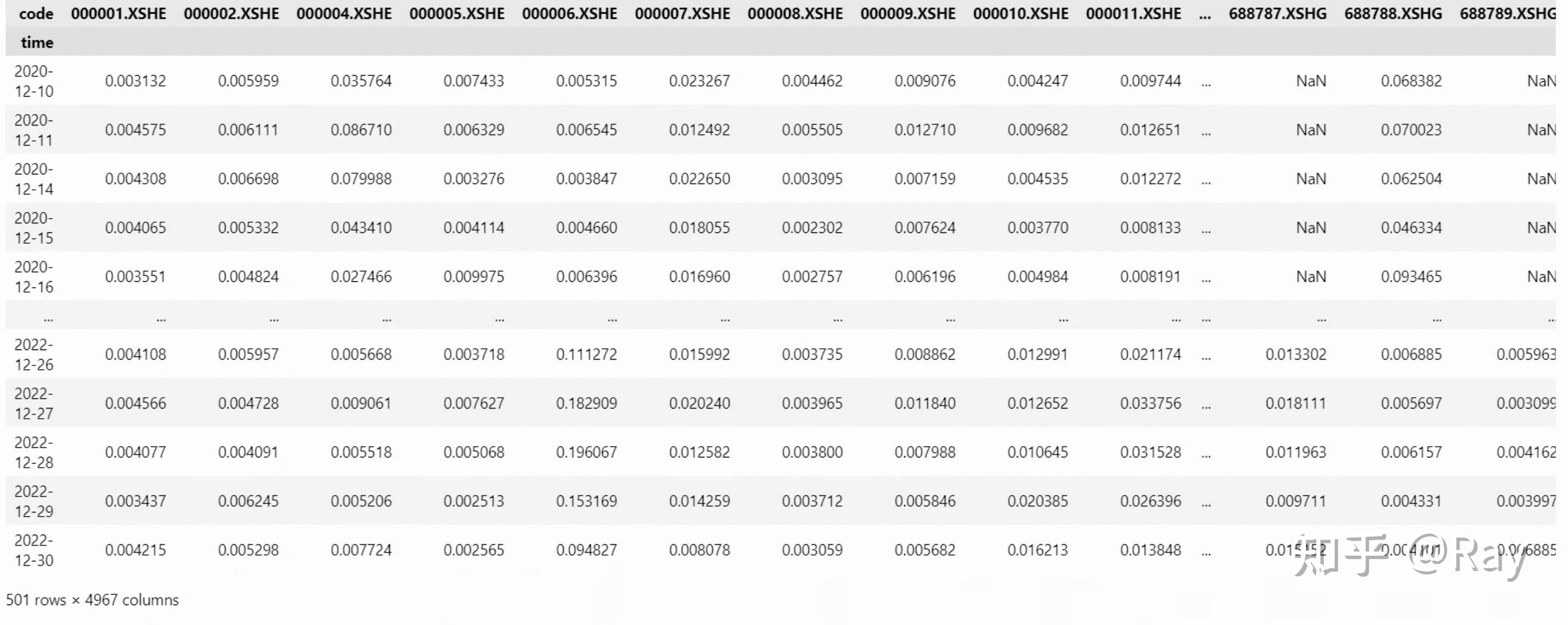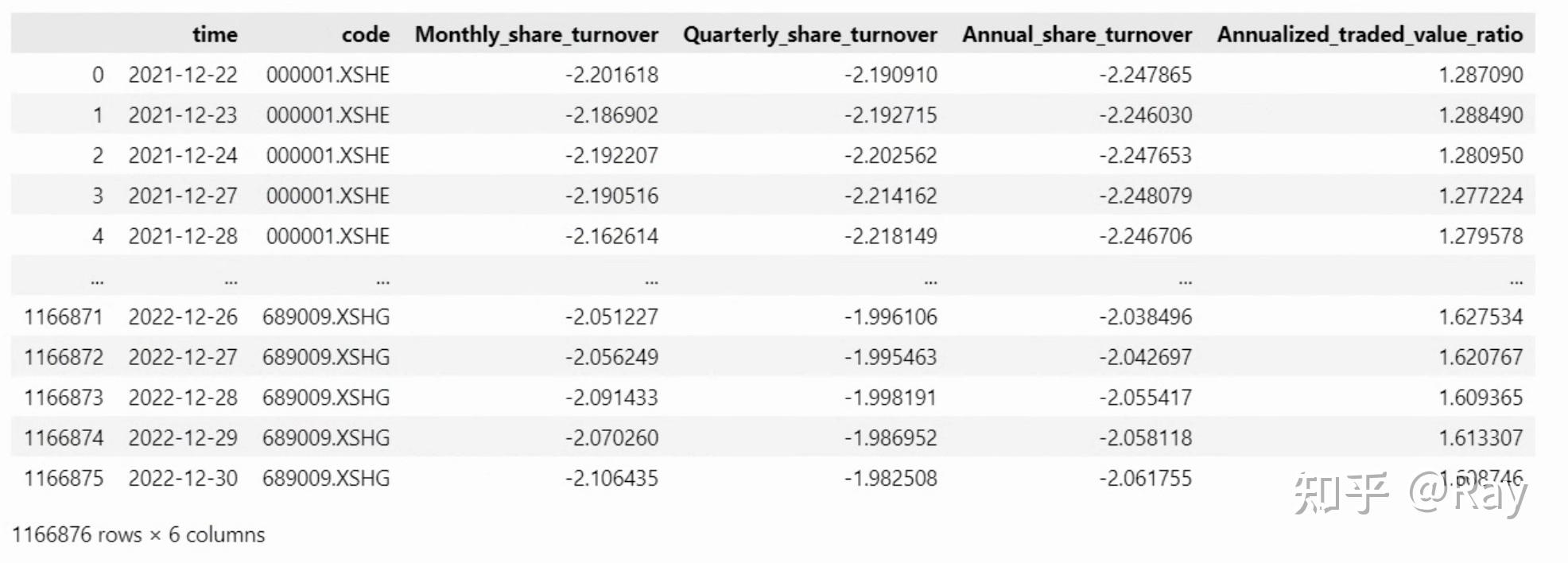Annual share turnover(三级因子):年换手率。将上式中的T酿成12。Annualized traded value ratio(三级因子):年化交易量比率。对日换手率停止加权乞降,时间窗口为252个交易日,半衰期为63个交易日。4.2.代码实现 4.2.1.数据筹办活动性因子计算次要利用了股票的换手率数据,而换手率数据保留在估值数据表格中。我们先利用以下代码提取并整理数据。留意,那里的换手率为百分比形式,我们需要对其停止转换。此外,操纵pandas数据透视表,能够将面板数据转化为矩阵形式。