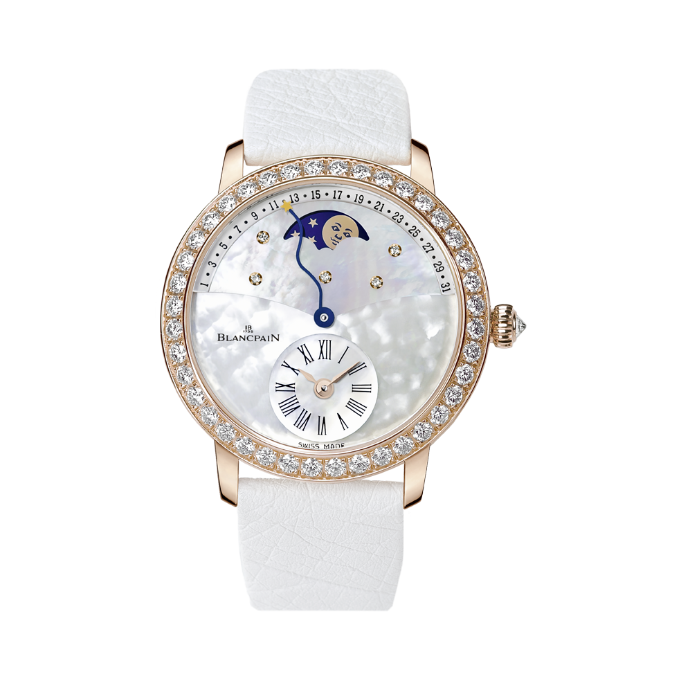 那就是一款集所有浪漫元素于一身的高端精巧女表,款手表集合了宝珀有史以来更具浪漫的元素于一身——珍珠贝母、华美钻石、灵动指针、优美月亮脸蛋等,令人偏“心”溺爱,无法自拔。该款搭载的是宝珀2012年初次推出的Cal. 2650RL主动上链机芯,此款机芯由镶有32颗宝石的302个部件构成,为6点钟方位的偏疼时间小表盘、12点钟位置的月相盘和中央逆跳日期指示供给动力,动力贮存65小时。此外,透过蓝宝石背透,明晰可见主动摆陀打形成五瓣花状,彰显此款手表精致文雅的女性气量。