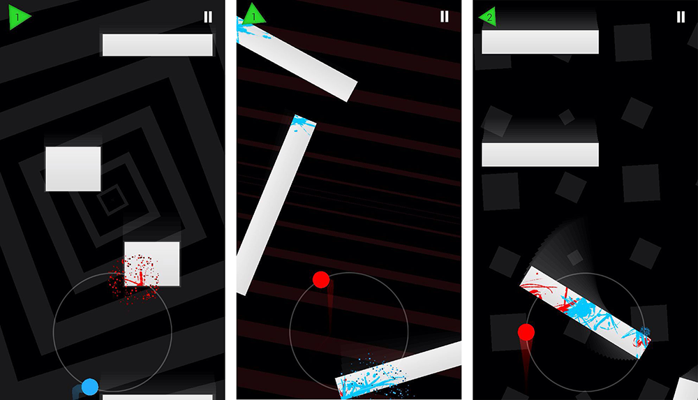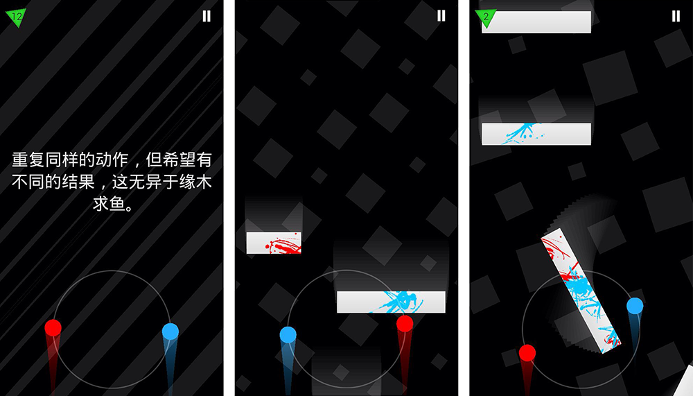 《二重奏》是款不行能让你手残还能够让你脑残的游戏。点击屏幕摆布两侧,别离控造红蓝两球顺时针或者逆时针扭转。小球碰着障碍物就算失败,并且颜色会溅射在障碍物上,无时无刻不在强调你个Loser。控造小球扭转时机已经不容易,障碍物TM还会扭转、消逝、挪动等,手速要跟上,脑速也不克不及拉下,筹谋你出来,包管不打死你。
