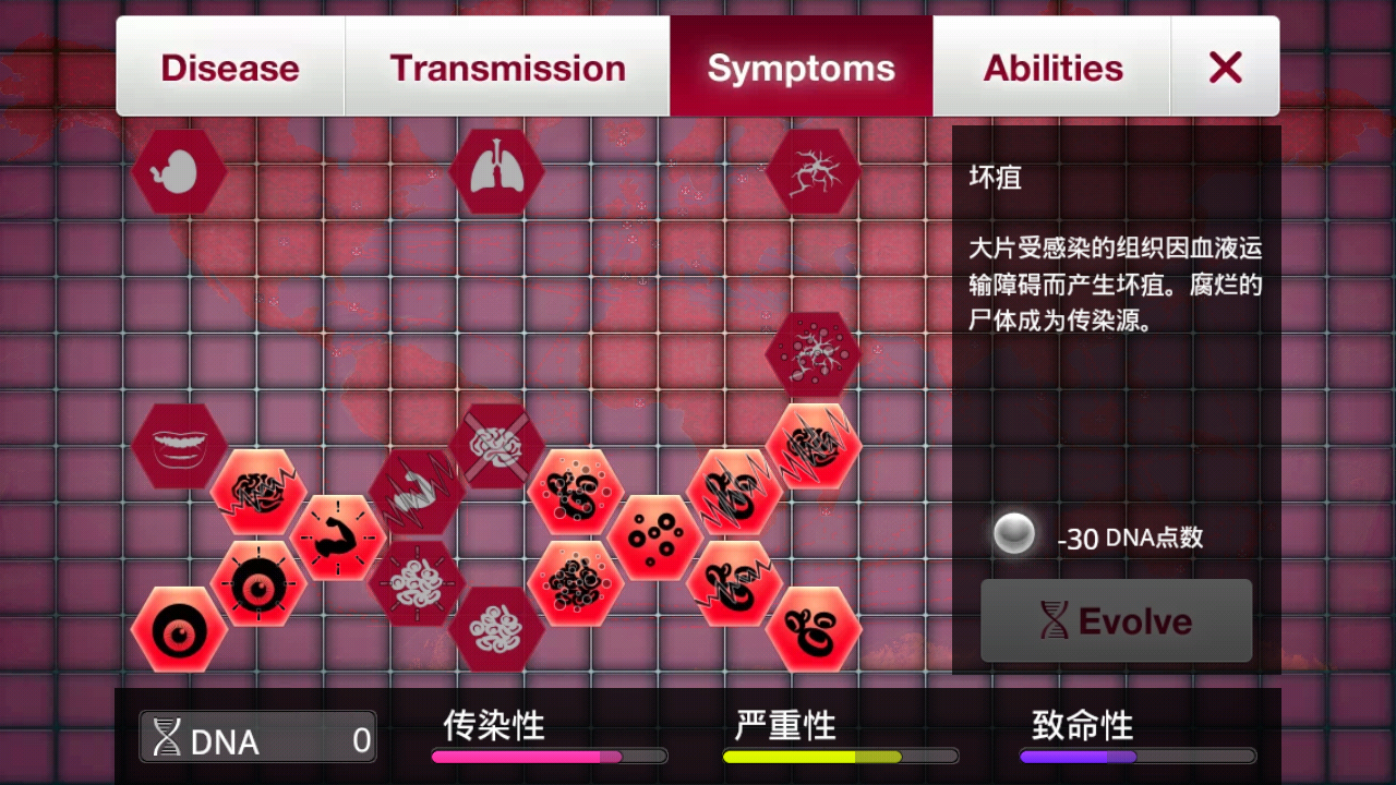 《瘟疫公司》是款病毒侵略战略游戏;起首选题十分反人类,需要做的是培育病毒传染人类,成功目的是覆灭全人类。病毒的培育很有意思,是增加传染性仍是致命性仍是抗药性,可不是随意乱加的,并且不要只顾着加强,有时降低属性反而更有效果。
