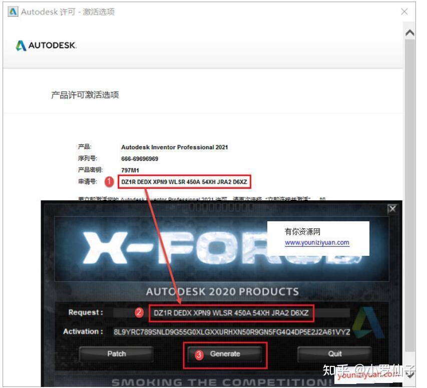 26.先将安拆界面中的“申请号”复造粘贴到注册机界面中“Request”栏后面的框中,然后点击【Generate】生成激活码,留意:复造粘贴只能利用快速键Crtl+C、Crtl+V