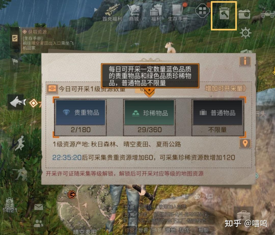 小斧头按钮能够查看稀有物资每日更大可运输剩余数量(注:伐木收罗小树枝时必然要记得给骨头铁矿根茎260收罗量。建议小树枝100,骨头100,铁矿100,根茎60。)
