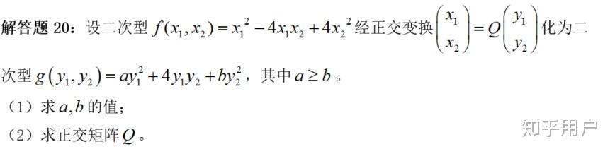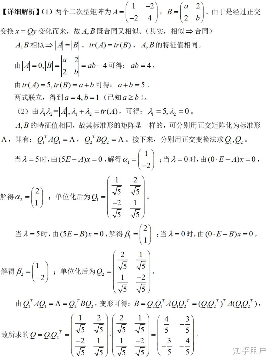 【阐发】本题比力新颖, A 经正交变更到 B ,两个二次型矩阵是什么关系?要熟悉原始的推导过程: f(x)=x^{T} A x=(Q y)^{T} A(Q y)=y^{T}\left(Q^{T} A Q\right) y=y^{T} B y=g(y) ,可见,两个二次型矩阵的关系是:既合同 B=Q^{T} A Q 又类似 B=Q^{-1} A Q (因为 Q 是正交矩阵)。通过合同和类似的一些性量,就能求出系数。第二问求正交矩阵,那个需要转换思绪,我们只会求 A \rightarrow \Lambda 和 B \rightarrow \Lambda \text {} 时的正交矩阵,但因为 A,B 类似,有不异的特征值,故都可化为统一个对角矩阵 \Lambda ,所以别离求出两个正交矩阵,通过 \Lambda 得到关系式,最初变更为 B=Q^{T} A Q 的形式,即可得到成果。