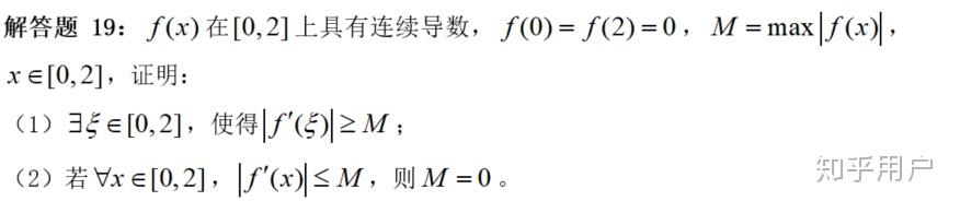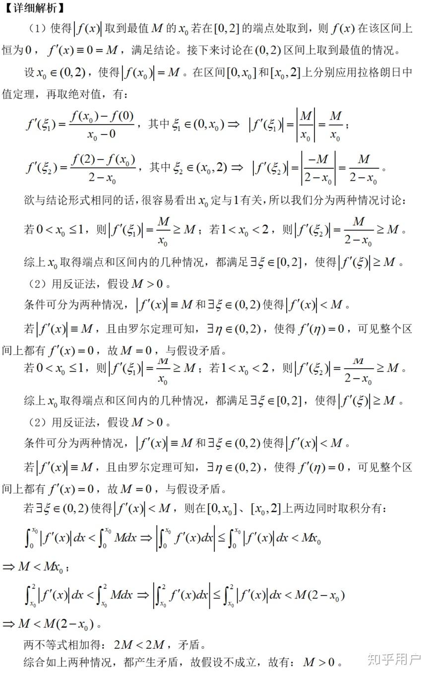 【阐发】察看第(1)问,含有一个中值的导数,能够阐发出本题应该用到拉格朗日中值定理。本题给了三个点 x=0,2 以及使得 \left| f(x) \right| 取到更大值 M 的 x_{0} ,那么必定应该是在那三个点构成的两个区间上别离应用中值定理。第(2)问属于出格难那种证明题。结论中含有 \forall ,故可考虑用反证法。