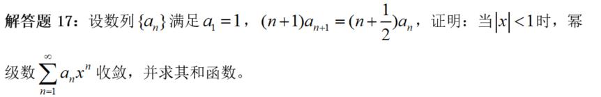 【阐发】先证明后计算。认真阅读那个证明题,其实也是一个求幂级数的收敛区间的计算题。操纵常识框架,马上想到求收敛半径的两种手段:一是一般幂级数 \sum_{n=0}^{\infty} u_{n}(x) 情形(可能出缺项);二是尺度幂级数 \sum_{n=0}^{\infty} a_{n} x^{n} 情形(不缺项)。本题那两种手段都能够,我们用第一种。用比值法 \lim _{n \rightarrow \infty} \frac{\left|u_{n+1}(x)\right|}{\left|u_{n}(x)\right|}=\rho(x) ,令