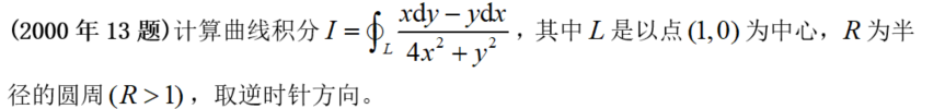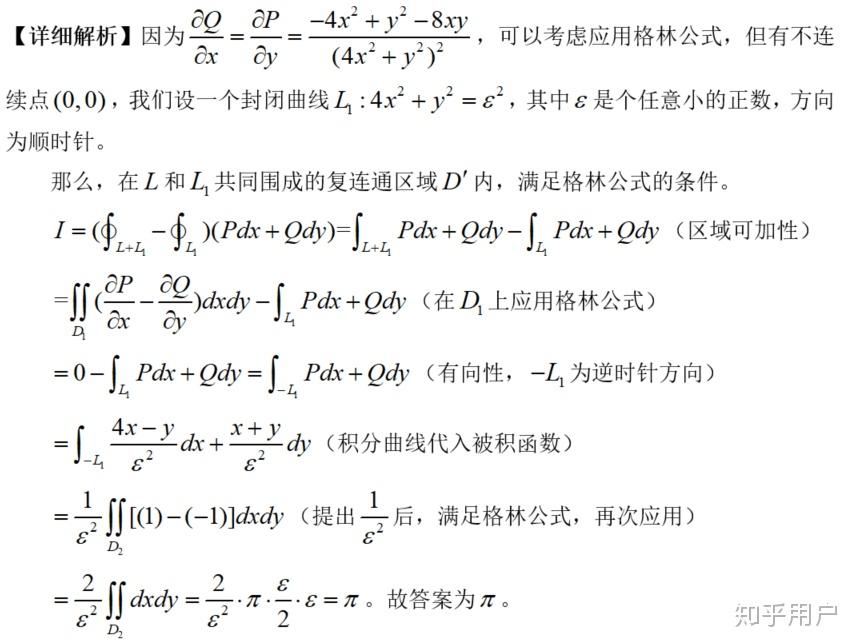 【阐发】操纵常识框架,第二类曲线积分的计算有“三大根底性办法”(包罗间接计算、格林公式、积分与途径无关定理)和“两小技巧性办法”(包罗曲线方程代入被积函数、对称性)。简单验算一下,发现 \frac{\partial Q}{\partial x}-\frac{\partial P}{\partial y} 为零,故我们选用格林公式。但要留意格林公式的前提,一曲直线 L 必需封锁且正向;二是 P(x, y), Q(x, y), \frac{\partial Q}{\partial x}, \frac{\partial P}{\partial y} 那四个函数在平面闭区域 D 上必需持续。本题满足第一条,但不满足第二条,有一个不持续点 (0,0) ,该点处分母是零。响应的处理办法是“挖洞法”,且按照分母形式来找“洞”,即找一个小封锁曲线 4 x^{2}+y^{2}=\varepsilon^{2} ,使得积分容易处置。