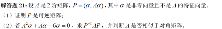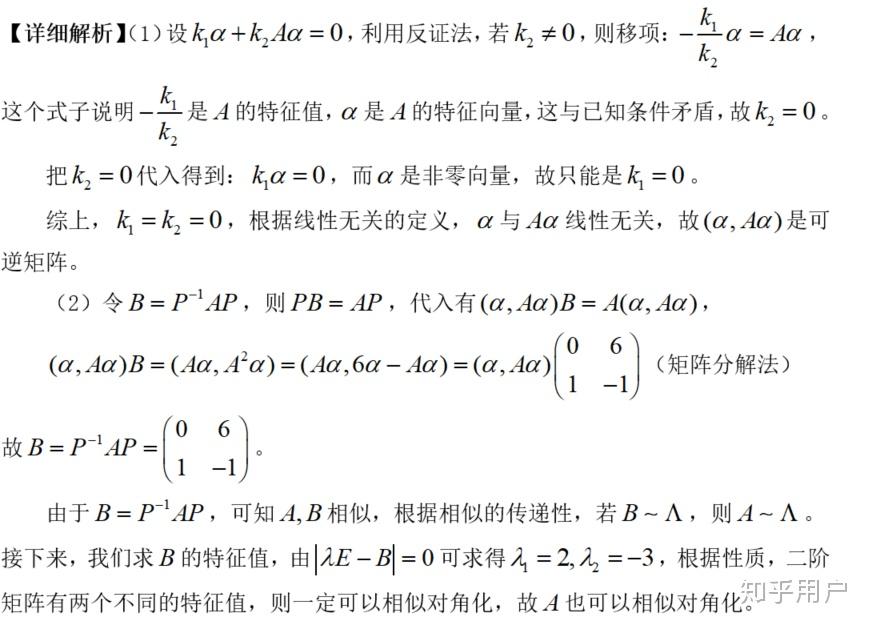【阐发】操纵常识框架,矩阵可逆的证明办法常用的有:①定义;②行列式不为零;③ r(A)=n ;④行(列)向量组线性无关;⑤构成的方程组有独一解;⑥特征值全不为零;⑦ A^{T} A 是正定矩阵。挨个试一下,本题中前提比力少,并且不是详细向量,所以我们选择④,判断列向量组能否线性无关。用线性无关的定义,连系已知前提,很容易证得。第二问较难一些,良多同窗卡在了开头的关键思绪上,此题最关键的思绪是:因为矩阵 是笼统的,其逆矩阵求不出,所以若求 B=P^{-1} A P ,只能做变形处置,即 P B=A P 。那是个常见的处置办法,特征值、特征向量的求法就来源于此。