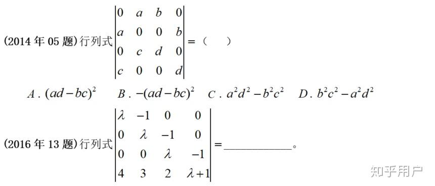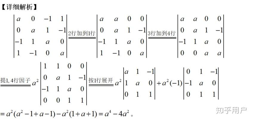 关于低阶行列式,先操纵行列式的性量,变形出尽可能多的零元素,更好是某一行只含1或2个零元素,于是就能够按那一行展开,转化为三阶行列式,而三阶行列式是有公式的。