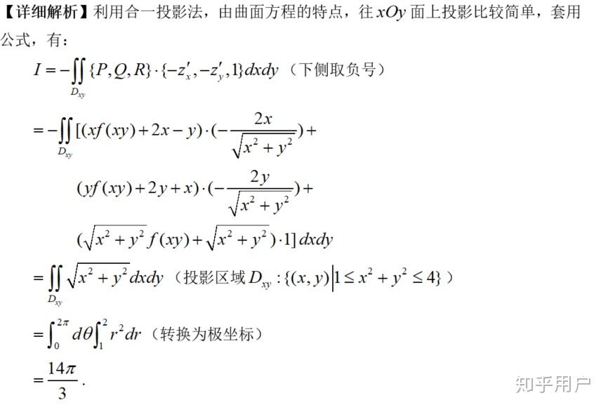 【阐发】挪用常识框架,第二类曲面积分的计算有如下办法:三大根底性办法”(包罗间接计算、合一投影法、高斯公式)和“两小技巧性办法”(包罗曲线方程代入被积函数、对称性)。此中,被积函数中含有笼统函数招致高斯公式利用未便,且分面投影的间接计算法也不成行,所以,能够锁定处理办法为:合一投影法。合一投影法素质上是操纵两类曲面积分之间的关系,先转化为第一类曲面积分,再转化为某一坐标面上的二重积分。