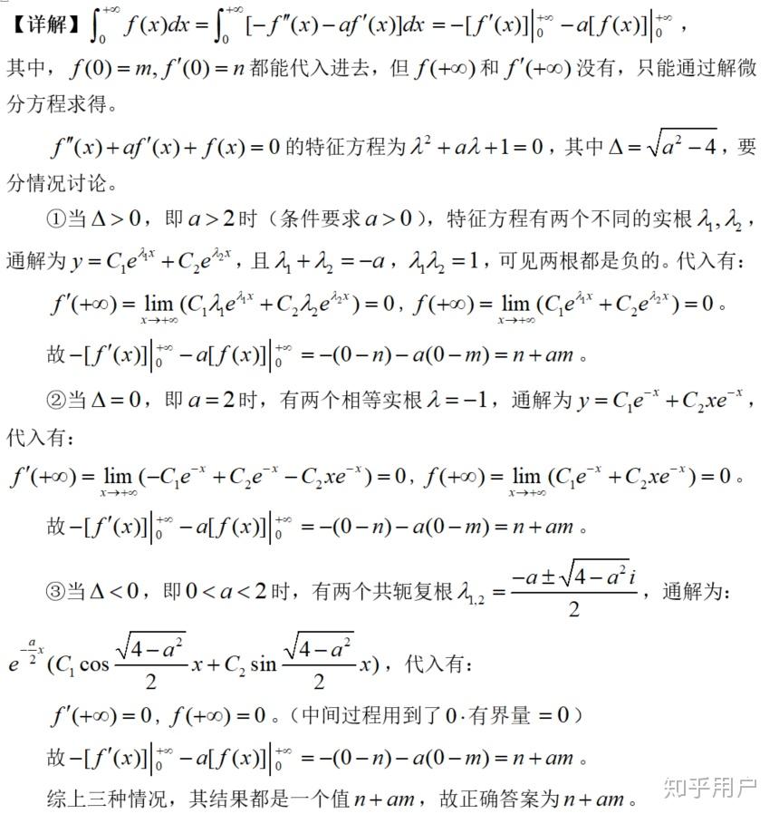 【阐发】属于稀有题型,没什么套路,所以用“前提结论阐发法”。看前提,有个高阶微分方程,马上想到可能要求通解;再看结论,是个广义积分,求出原函数,代入极限即可,但关键是:笼统函数求不出原函数啊!所以,笼统函数只能笼统来算,找笼统关系式。前提中正好有一个关系式,能够代入尝尝,正好能求出原函数。