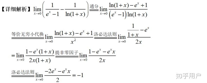 【阐发】先间接代入,是\infty-\infty 型,再挪用常识框架,该类型的处置办法凡是有四种:①通分;②有理化;③提因子;④变量代换(尤其是倒代换)。此题是分式,故通分。接下来,进一步化简,化到不克不及再化简后,运用洛必达法例,搞定。