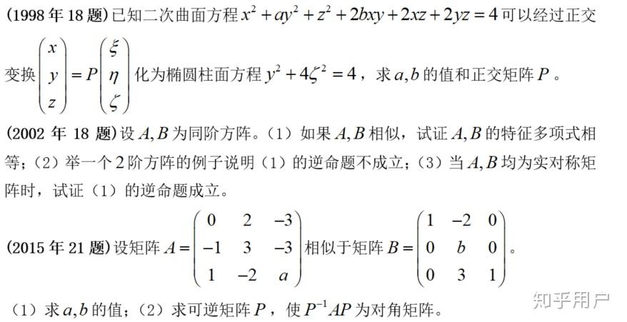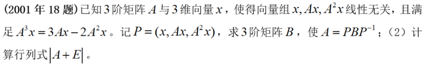 【总结】第一问是两个矩阵类似,操纵性量求矩阵中的未知量,与2015年和1998年的实题十分类似。第二问是求 P^{-1} A P=B 中的可逆矩阵 P