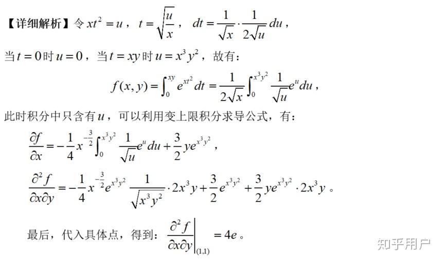 【阐发】那是个常见题型——被积函数同时含有上限变量 x 和积分变量 t 的变限积分的求导。但又有所立异,又连系了混合偏导数的计算。起首,把那个变限积分求出来,操纵常识框架,核心思惟是让被积函数中只含有积分变量,而不含 。又分为两种情况:①情形一:被积函数中的 可别离,则把含 的表达式提到积分号外。②情形二:被积函数中的 不成别离,则需要做换元处置。此题显然属于情形二,要做换元。