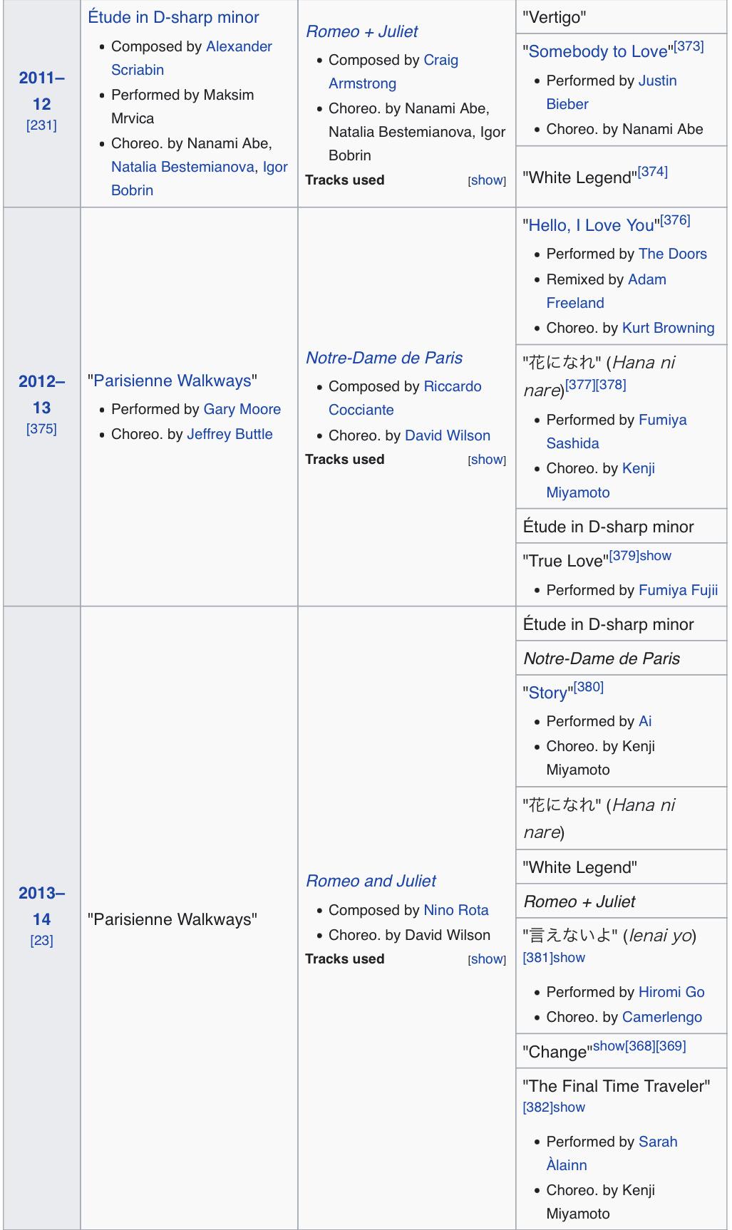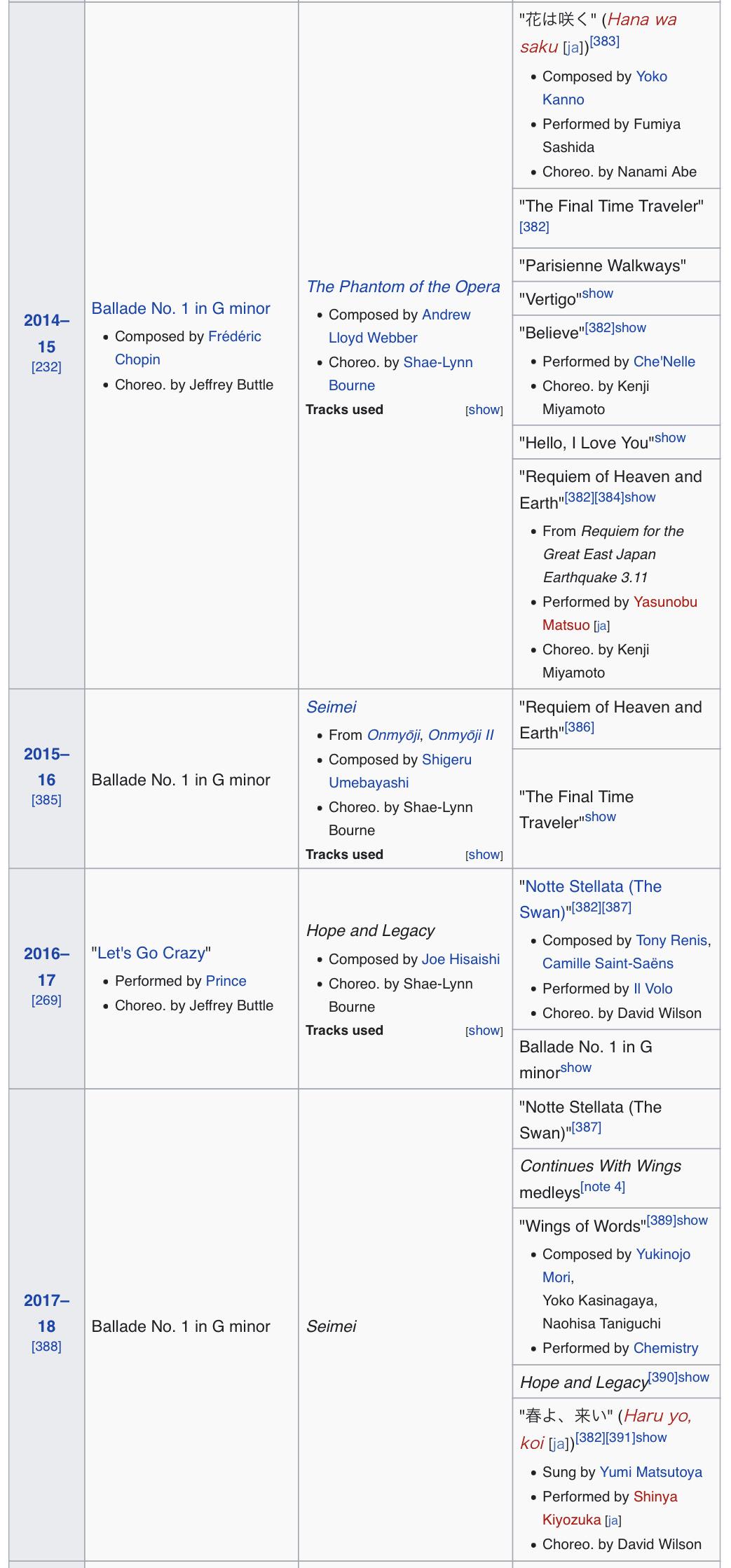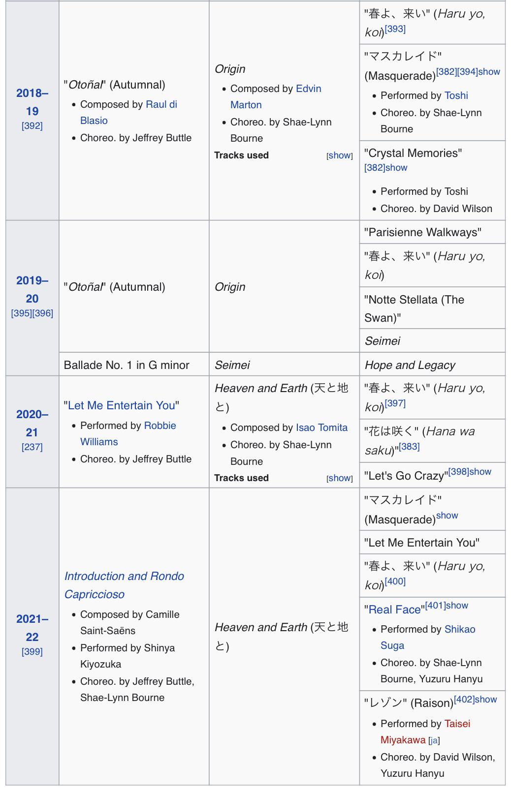 Yuzuru Hanyu所有赛季的节目与演出滑,包罗选曲、编舞、考斯滕如下