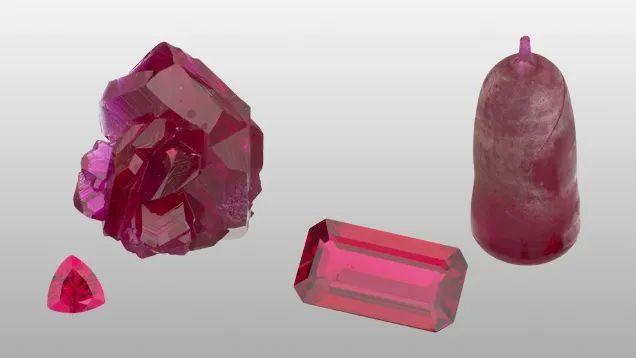 助溶剂法合成红宝石(左)和焰熔法合成红宝石(右)的晶体-刻面宝石比照 GIA