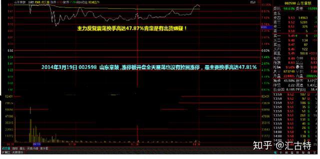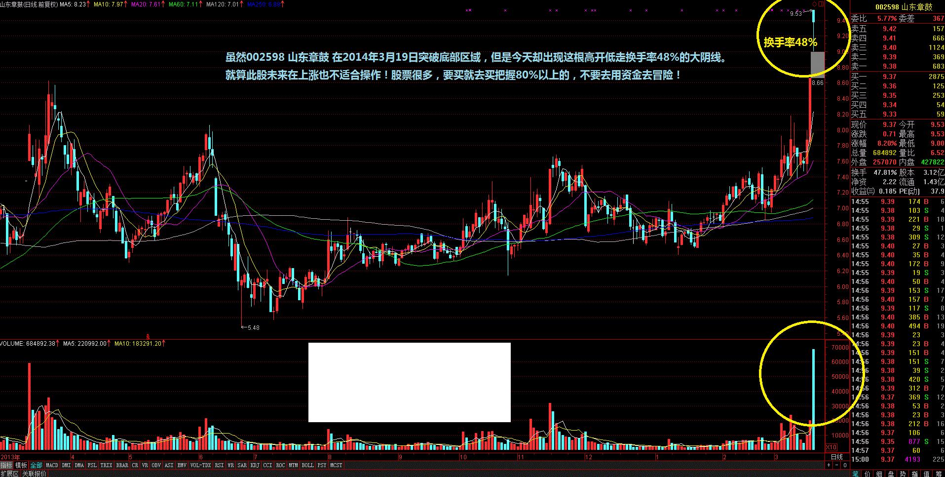 5:固然002598 山东章鼓 在2014年3月19日打破底部区域,但是今天却呈现那根高开低走换手率48%的大阴线。