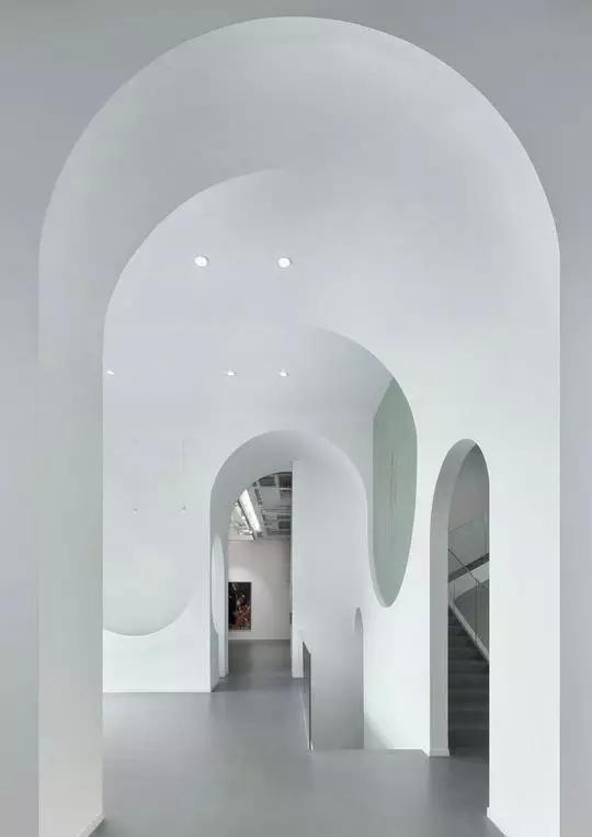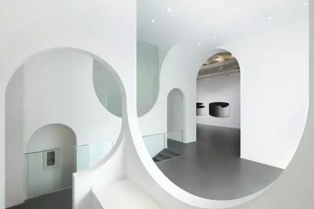 鸿坤美术馆白色的外立面在纷乱冗杂的街道中非常夺目。拱形的门寓意进入别的一个世界,在古典与现代的交融中进入空间,视线忍不住会随流水般的弧形起伏而挪动。墙面上的圆形镂空设想交织堆叠,让艺术品和不雅者的想象力有了更完美的互动。