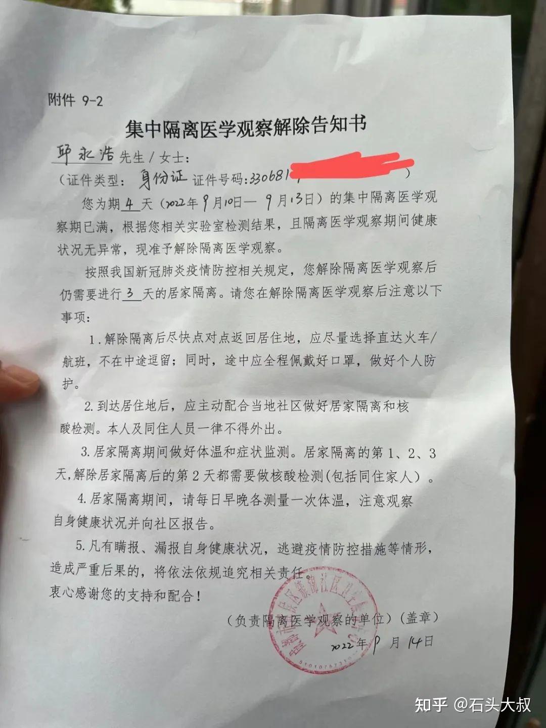 下战书5点大白来敲门,我还认为今天怎么那么早就送晚饭了,成果开门才晓得,本来我解除隔离能够回家了,于是马上给社区报备,社区说不可,你家小区仍是高风险,不克不及回,又跟大白反应,大白说,那个车就是社区派来接你的,于是就拾掇工具,下楼拿了《集中隔离医学察看解除告知书》,做了注销,然后出了酒店。当我要上大巴车的时候,司机问我住哪里?一听不远,就说大巴车还要等人,你能够走归去,于是我就高兴地行走在了回家的路上,就算下着雨,仍然觉得那是风雨无阻的事。