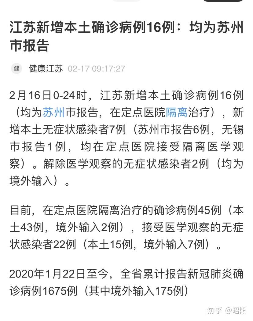 2月17日更新:2月16日江苏新增确诊病例16例,均在苏州。新增无症状传染者7例,6例在苏州,1例在无锡。截行目前苏州疫情尚未抵达拐点
