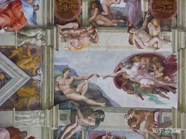 再看看每小我的动做和脸色,耶稣伸出右臂,用手指指向某处。那个手指其实也十分像米开朗基罗在西斯廷天顶上的那幅《创世纪》亚当的手指。