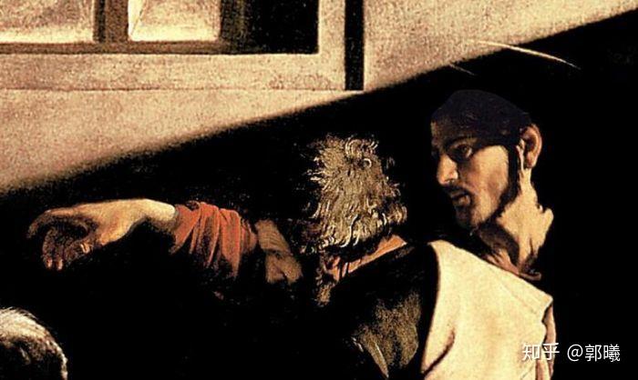 那里的耶稣其实就是一个通俗人的形象,他并没有像其他的圣经**画中那样,头顶着光环像鬼魂一样飘着,身边也没有那些光屁股的小天使。相反卡拉瓦乔只是把耶稣隐藏在了暗中中,而且用巧妙的光线引导不雅寡把视线集中到圣马太的身上。