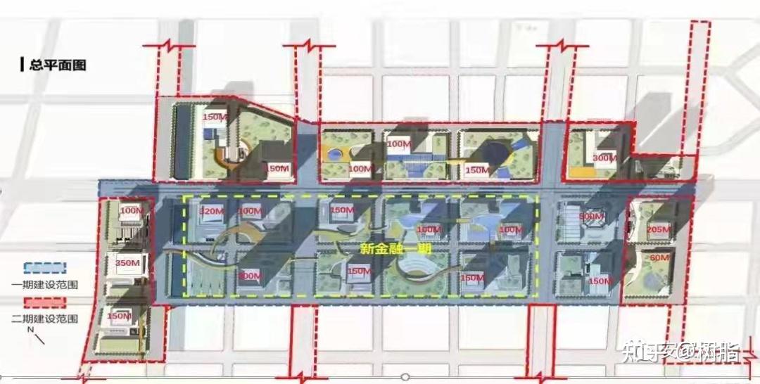 新金融中心二期包罗1栋350米、1栋250米的超高建筑,除此之外还有1栋200米,2栋150米,1栋100米的高层建筑。
